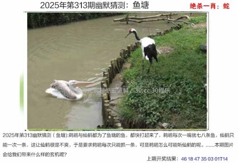 | 313期图片猜测(鱼塘) 鹈鹕与仙鹤都为了鱼塘的鱼,都快打起来了,鹈鹕每次一嘴就七八条鱼,仙鹤只能一次一条,这让仙鹤很是不爽,于是要求鹈鹕每次只能抓一条,可是鹈鹕怎么可能听仙鹤的呢。......本期图片会给我们带来什么样的玄机呢? 解:鱼解家禽生肖牛猪鸡羊狗马幽默猜测综合取肖:龙狗马鼠兔虎 |